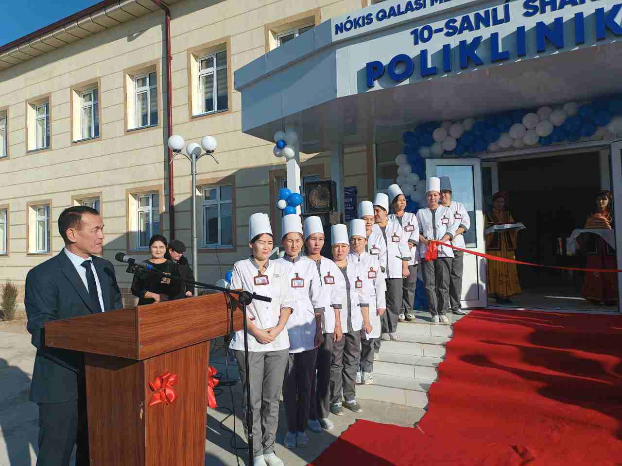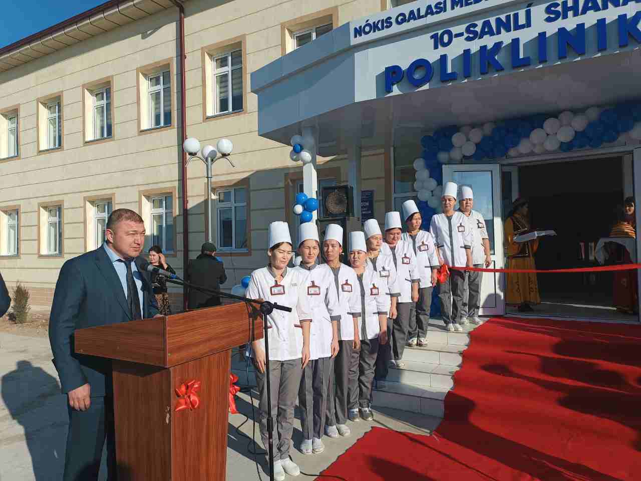 Ашылыў мәресимине Қарақалпақстан Республикасы Жоқарғы Кеңеси комитет баслығы Д.Қурбаниязов, ҚР Денсаўлықты сақлаў министри М.И.Қурбанов қатнасып медицина тараў хызметкерлерин жаңа поликлиниканың ашылыў салтанаты менен қызғын қутлықлады.