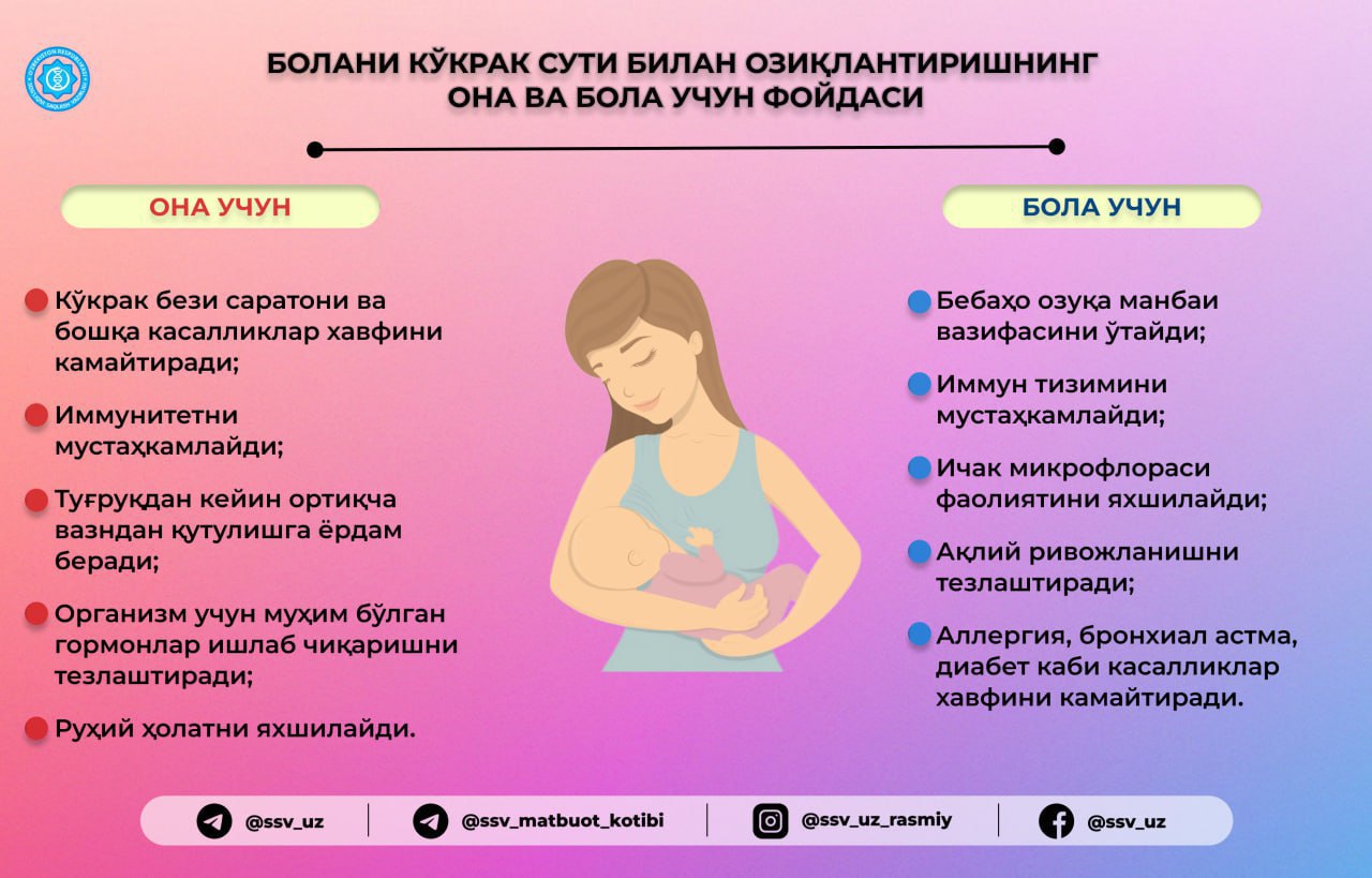 Bolalarni olti oylik bo‘lguncha faqat ona suti bilan ovqatlantirish ham chaqaloqning, ham onaning salomatligi uchun foydali.